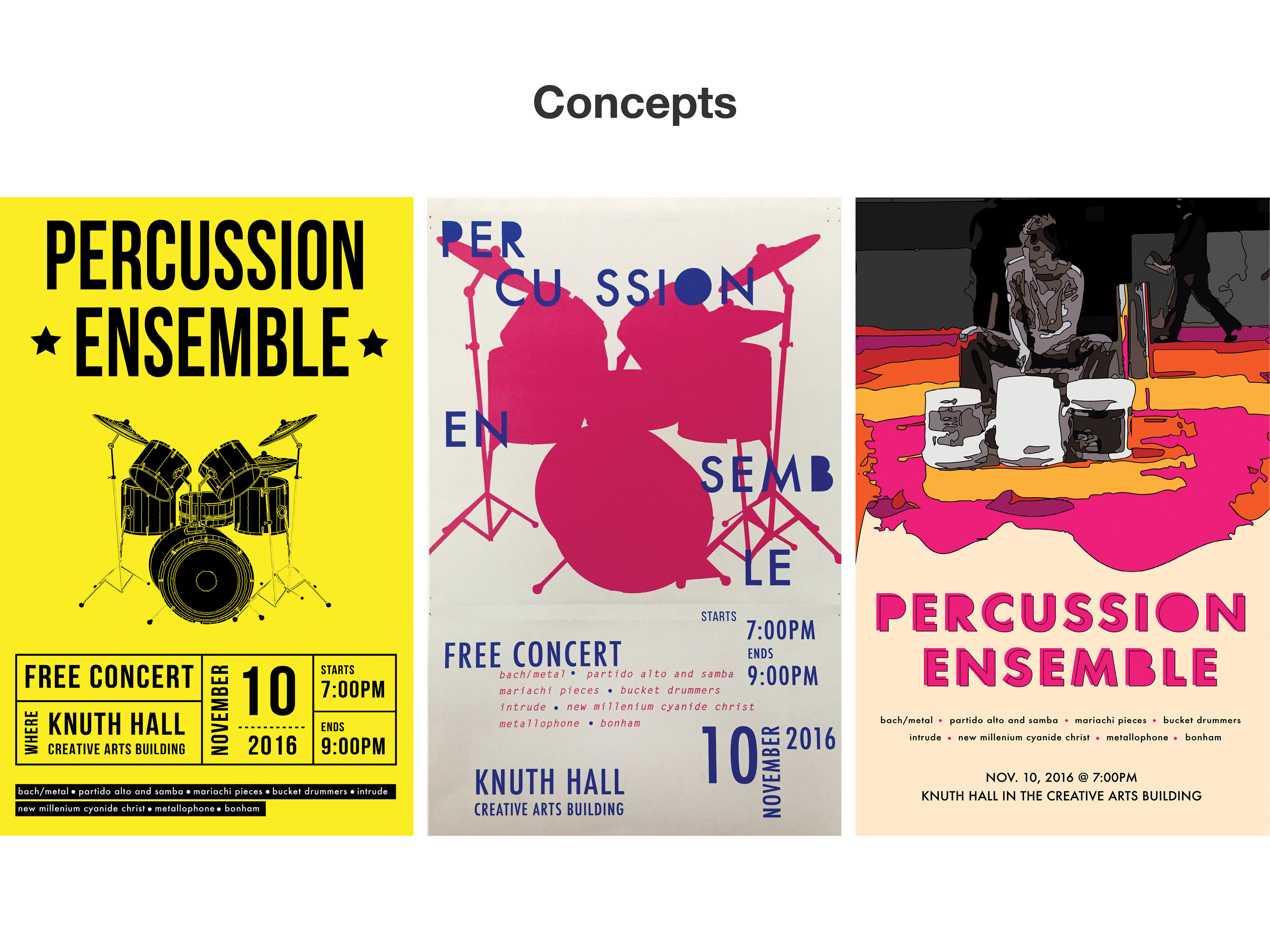 Promotional poster for San Francisco State University's Percussion Ensemble annual show. The show featured bucket drummers, student built percussion instruments, and other eclectic acts.